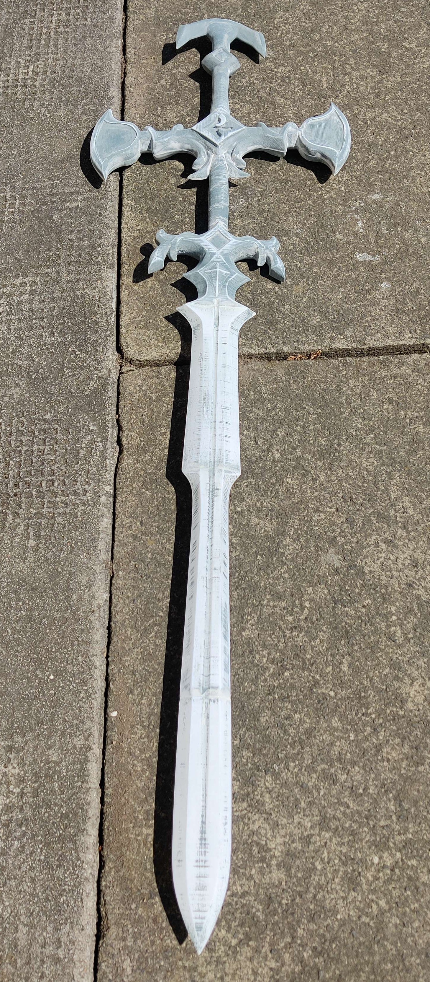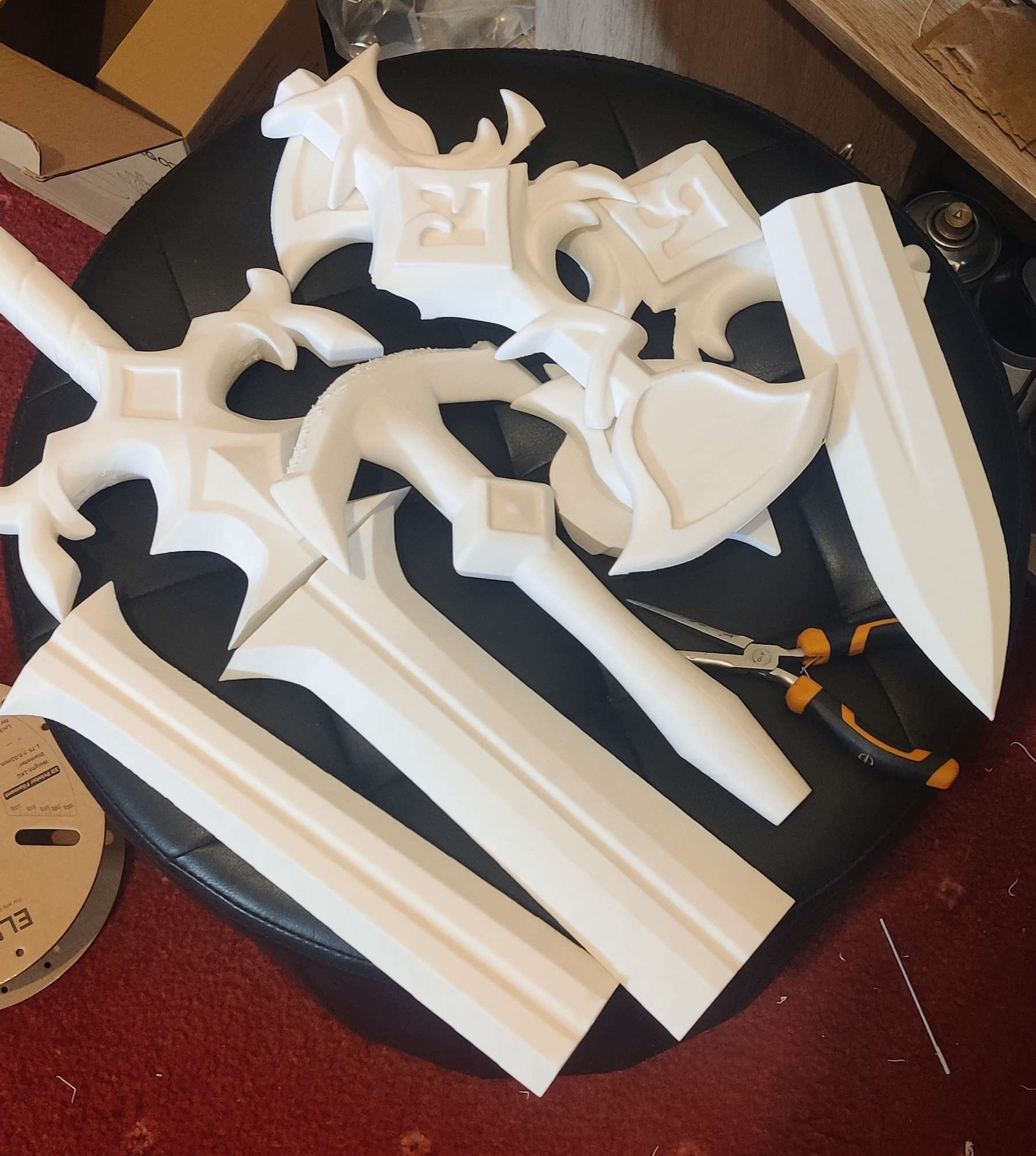 Once all the seperarte pieces are printed I connected them all with dowles and started sanding to remove the layer lines to the best of my ability. Since this blade was long and thin, I was unable to find a dowl that fit prefectly, and instead opted to use multiple thunner dowles to get a stirdy hold.